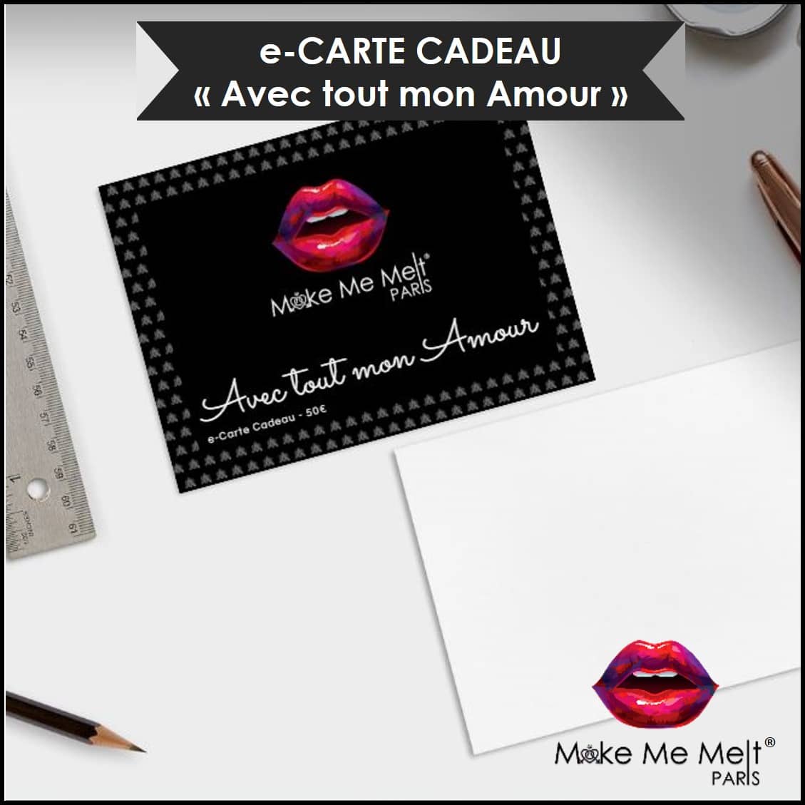 Offrez comme vous aimez avec cette carte cadeau électronique Make Me Melt Paris®. Cette carte "Avec tout mon Amour" sera idéale pour faire un cadeau à l'être aimé.