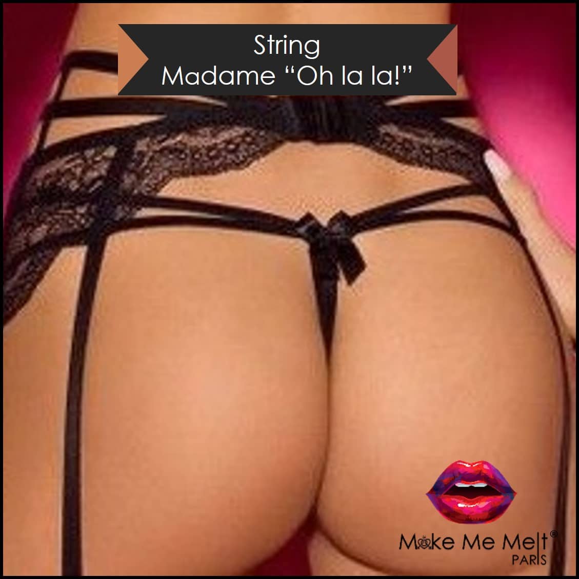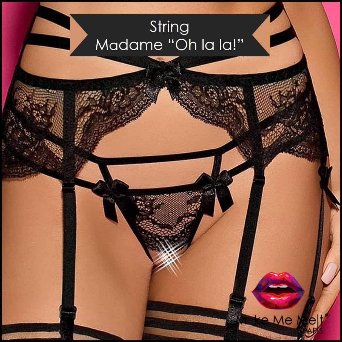 Ce string possède une petite partie de dentelle de haute qualité sur l'avant et un double élastique pour dessiner les hanches. Des petits nœuds de satin noir viennent le sublimer. Ce string fait également partie du LOVE BOOSTER « Madame Oh la la! ».