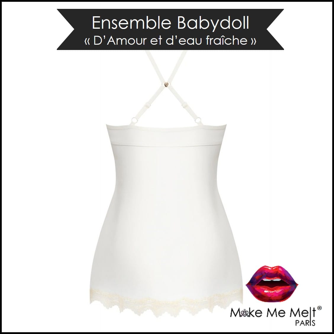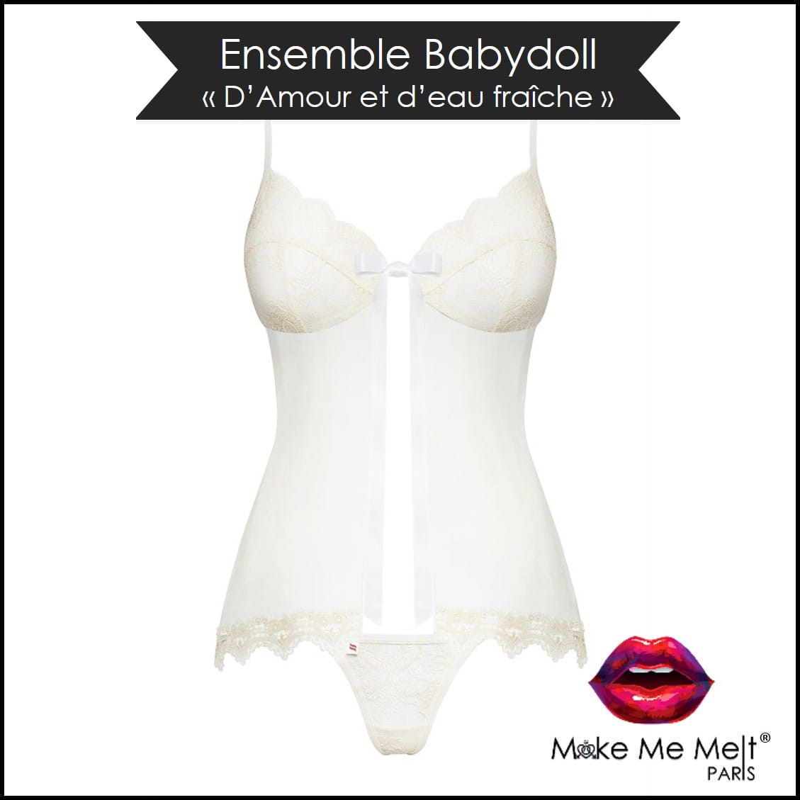 Cet ensemble est composée d’une nuisette courte (babydoll) et d’un string assorti couleur ivoire. Les bretelles sont réglables pour s'ajuster à votre silhouette. Les lanières se croisent dans le dos pour un effet sexy à souhait. Les bonnets ont des armatures en dentelle et assurent un bon maintient. Cet ensemble fait également partie du LOVE BOOSTER "D'Amour et d'eau fraîche".